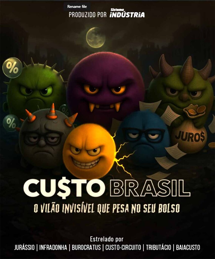 De forma lúdica, a CNI apresenta seis personagens que são os principais fatores para a conta de R$ 1,7 trilhão por ano desperdiçados no Brasil, de acordo com dados do Observatório Custo Brasil (OCB). Jurássio, o monstro que representa a alta taxa de juros; a Infradonha, com o custo das obras paradas e as consequências da ausência de ampliação e diversificação da matriz logística; o Burocratus, com a morosidade da burocracia; Custo Circuito, que representa o valor da energia para lares e empresas; o Tributácio, mostrando que os tributos estão por todos os lados; e o Baiacusto, que reúne o peso de todos eles, representando as perdas do Custo Brasil.